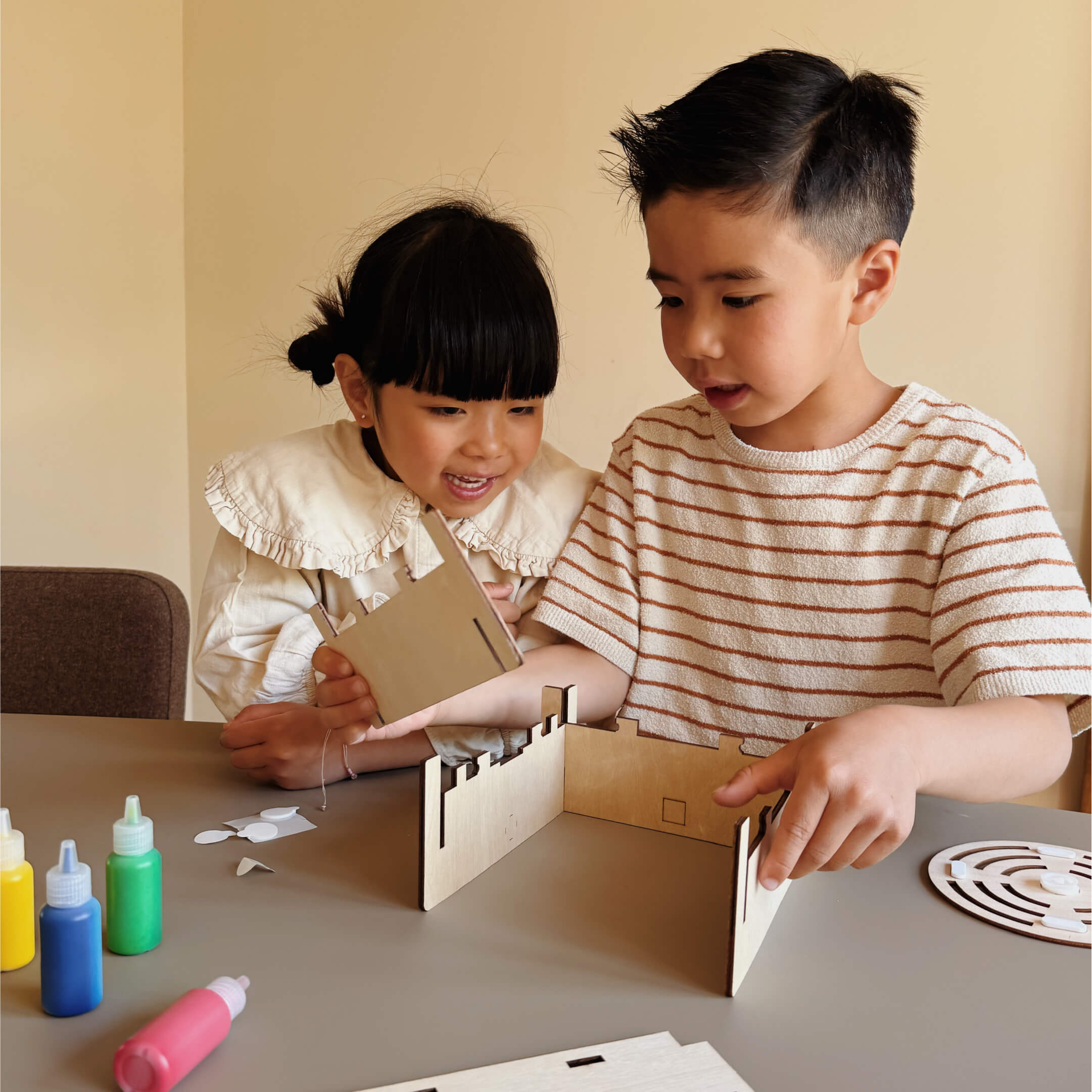 Nee, alles wat je nodig hebt zit in de box. Van houten onderdelen tot stickers en zelfs een duidelijke instructies, je hoeft niets extra’s in huis te halen. Het enige wat je nodig hebt is een tafel, wat ruimte en nieuwsgierige kinderen. De box is dus écht plug-and-play, ideaal voor een feestje zonder stress of voorbereiding.